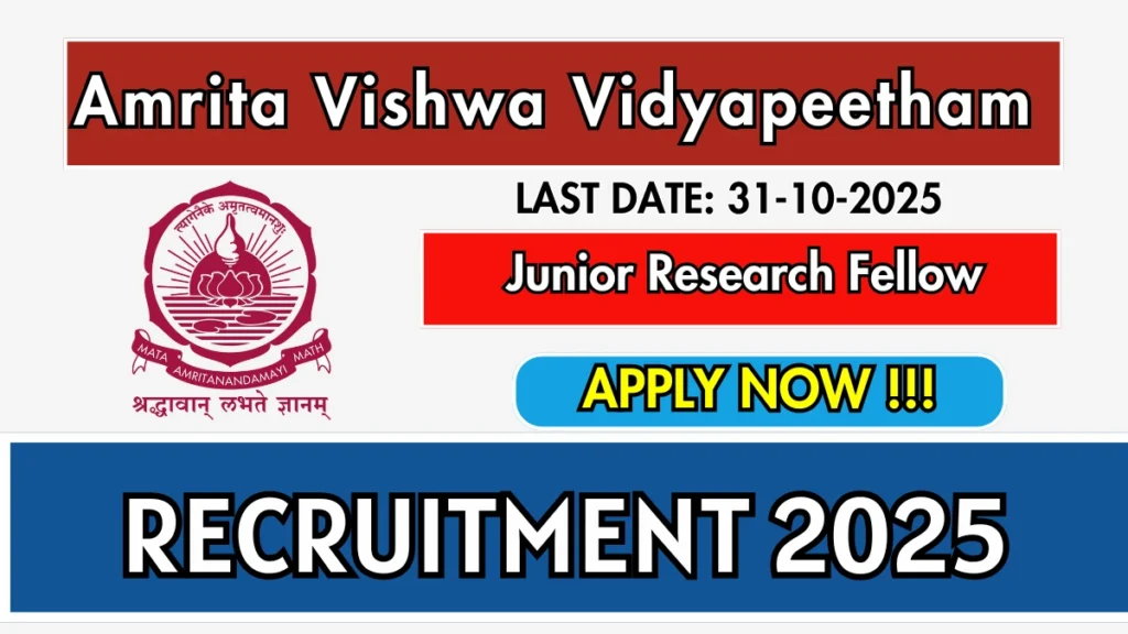 Amrita Vishwa Vidyapeetham Amaravati has released an official notification for the recruitment of Junior Research Fellow Posts. Interested and eligible candidates can apply Online through the official Amrita Vishwa Vidyapeetham Amaravati website. The last date to submit the application form is 31-10-2025. In this article, you’ll find the Amrita Vishwa Vidyapeetham Amaravati Junior Research Fellow Posts recruitment details, including eligibility criteria, age limit, salary structure, selection process, application steps, and direct links to the official notification and Online application form.