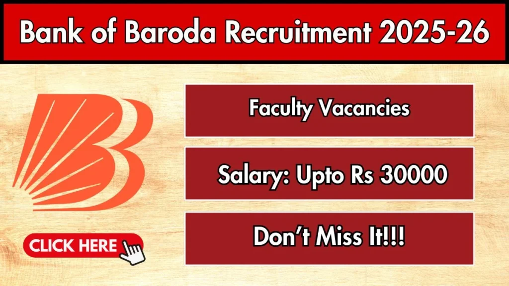Bank of Baroda has released an official notification for the recruitment of 01 Faculty Posts. Interested and eligible candidates can apply Offline through the official Bank of Baroda website. The last date to submit the application form is 10-01-2026. In this article, you’ll find the Bank of Baroda Faculty Posts recruitment details, including eligibility criteria, age limit, salary structure, selection process, application steps, and direct links to the official notification and Offline application form.