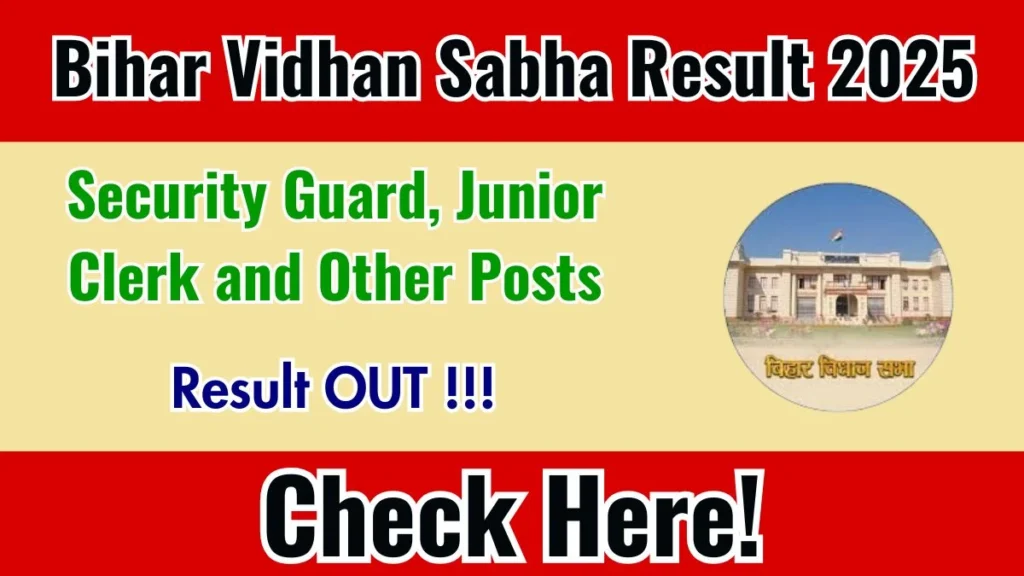 Bihar Vidhan Sabha Security Guard, Junior Clerk and Other Posts Result 2025 Released: The Bihar Vidhan Sabha has officially declared the Bihar Vidhan Sabha Result 2025 for the Security Guard, Junior Clerk and Other Posts today, 25-10-2025. Candidates can now check their results online. To view their qualifying status, candidates must enter their roll number and date of birth on the official website vidhansabha.bihar.gov.in.
