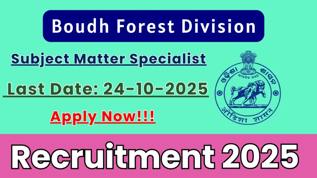 Boudh Forest Division has released an official notification for the recruitment of 01 Subject Matter Specialist Posts. Interested and eligible candidates can apply Offline through the official Boudh Forest Division website. The last date to submit the application form is 24-10-2025. In this article, you’ll find the Boudh Forest Division Subject Matter Specialist Posts recruitment details, including eligibility criteria, age limit, salary structure, selection process, application steps, and direct links to the official notification and Offline application form.