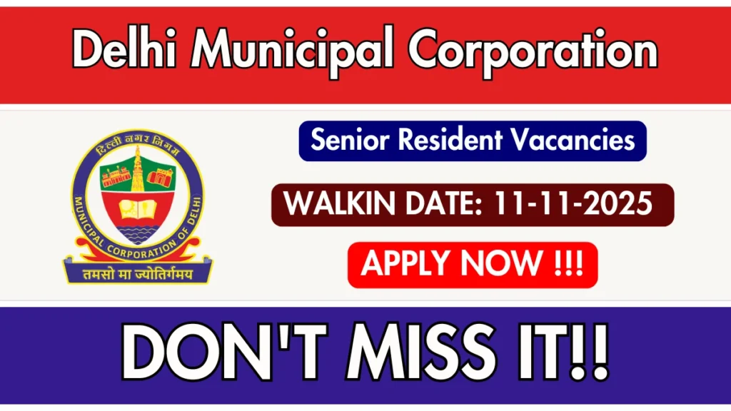 Delhi Municipal Corporation Recruitment 2025 for 34 posts of Senior Resident. Candidates with BDS, MBBS, PG Diploma, MS/MD Can attend the walkin. The Walk-in on 11-11-2025. For detailed information please visit Delhi Municipal Corporation official website, mcdonline.nic.in.