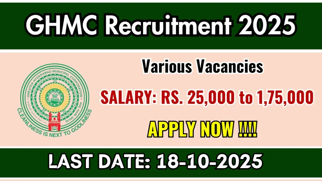 Greater Hyderabad Municipal Corporation (GHMC) has released an official notification for the recruitment of 17 Food Safety Expert, Veterinary Officer and More Posts. Interested and eligible candidates can apply Online through the official GHMC website. The last date to submit the application form is 18-10-2025. In this article, you’ll find the GHMC Food Safety Expert, Veterinary Officer and More Posts recruitment details, including eligibility criteria, age limit, salary structure, selection process, application steps, and direct links to the official notification and Online application form.