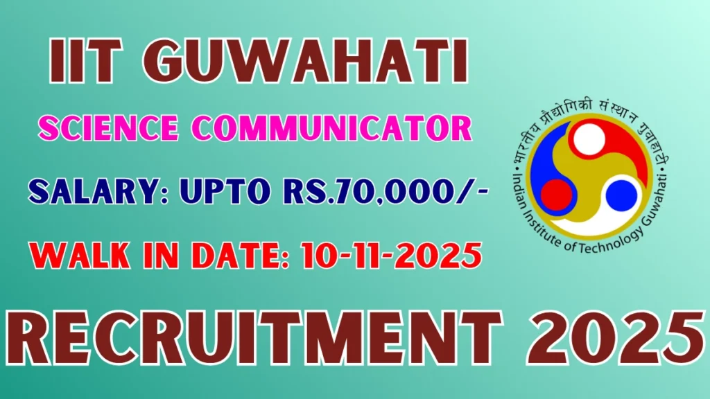 Indian Institute of Technology Guwahati (IIT Guwahati) Recruitment 2025 for 01 posts of Science Communicator. Candidates with M.Sc, M.E/M.Tech, M.Des Can attend the walkin. The Walk-in on 10-11-2025. For detailed information please visit IIT Guwahati official website, iitg.ac.in.