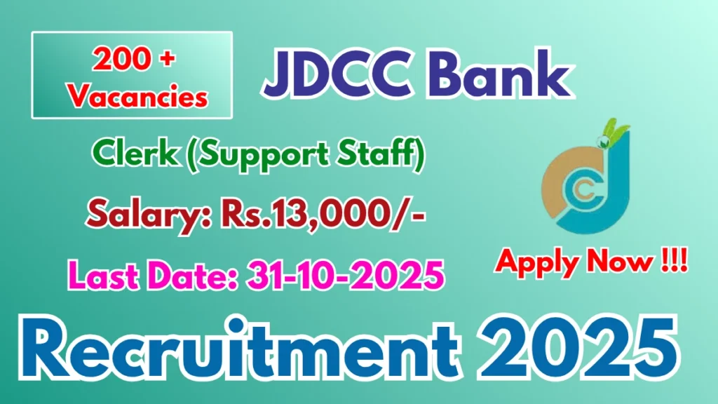 Jalgaon District Central Co Operative Bank (JDCC Bank)  has released an official notification for the recruitment of 220 Clerk Posts. Interested and eligible candidates can apply Online through the official JDCC Bank website. The last date to submit the application form is 31-10-2025. In this article, you’ll find the JDCC Bank Clerk Posts recruitment details, including eligibility criteria, age limit, salary structure, selection process, application steps, and direct links to the official notification and Online application form.