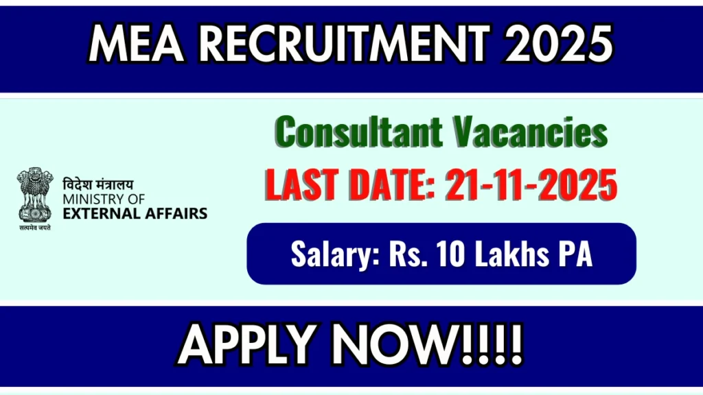 Ministry of External Affairs (MEA) has released an official notification for the recruitment of 01 Consultant Posts. Interested and eligible candidates can apply Online through the official MEA website. The last date to submit the application form is 21-11-2025. In this article, you’ll find the MEA Consultant Posts recruitment details, including eligibility criteria, age limit, salary structure, selection process, application steps, and direct links to the official notification and Online application form.