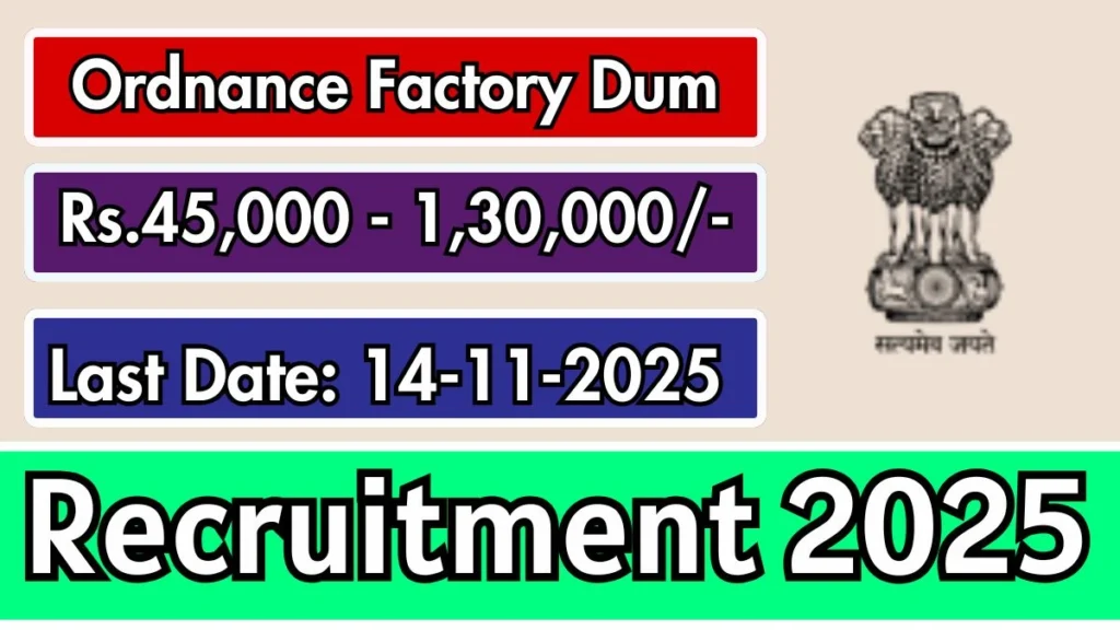 Ordnance Factory Dum has released an official notification for the recruitment of 2 Executive, Assistant Executive Posts. Interested and eligible candidates can apply Offline through the official Ordnance Factory Dum website. The last date to submit the application form is 14-11-2025. In this article, you’ll find the Ordnance Factory Dum Executive, Assistant Executive Posts recruitment details, including eligibility criteria, age limit, salary structure, selection process, application steps, and direct links to the official notification and Offline application form.