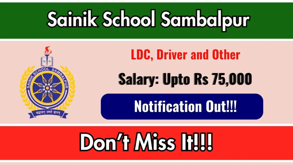 Sainik School Sambalpur has released an official notification for the recruitment of 13 LDC, Driver and Other Posts. Interested and eligible candidates can apply Offline through the official Sainik School Sambalpur website. The last date to submit the application form is 23-01-2026. In this article, you’ll find the Sainik School Sambalpur LDC, Driver and Other Posts recruitment details, including eligibility criteria, age limit, salary structure, selection process, application steps, and direct links to the official notification and Offline application form.