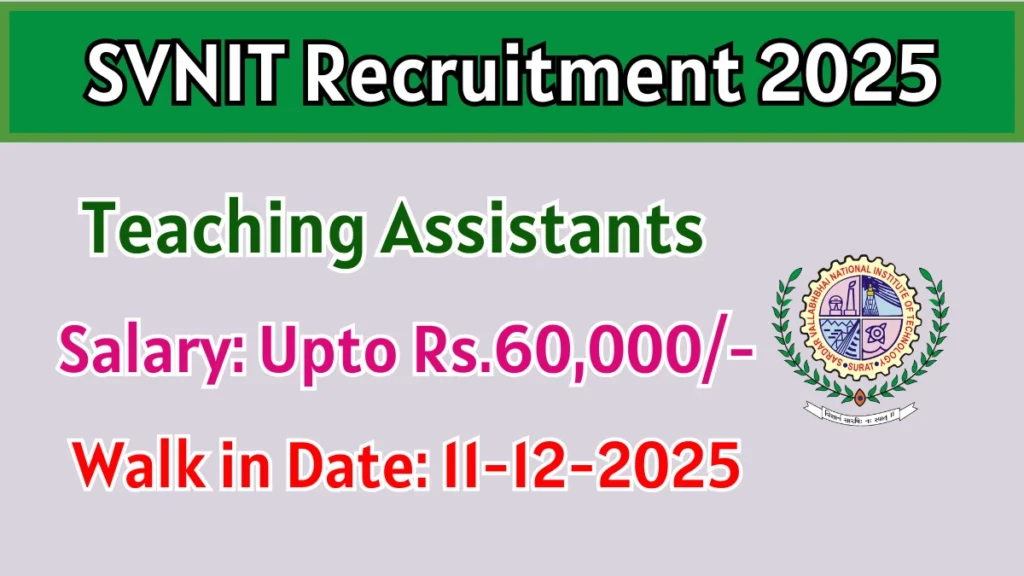 Sardar Vallabhbhai National Institute of Technology (SVNIT) Recruitment 2025 for posts of Teaching Assistants. Candidates with M.E/M.Tech, M.Phil/Ph.D Can attend the walkin. The Walk-in on 11-12-2025. For detailed information please visit SVNIT official website, svnit.ac.in.